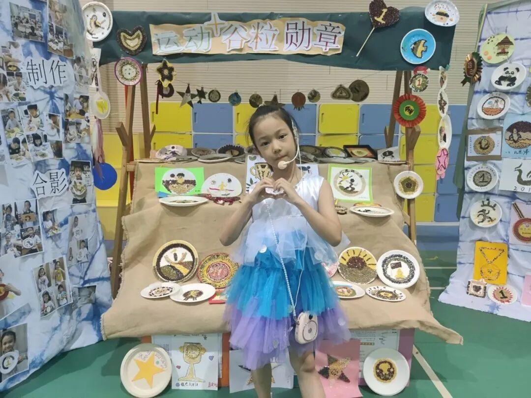 走进一年级展区,数十枚“谷粒勋章”错落陈列,宛如一片微型“丰收运动场”。小麦粒层层铺叠,勾勒出跑步健儿的冲刺姿态;玉米粒颗颗镶嵌,呼应跳跃项目的轻盈瞬间;更有学子以粮囤、麦穗为勋章轮廓,边缘点缀小小的篮球、跳绳图案,让“运动荣誉”与“丰收印记”紧紧相拥。讲解员生动地讲述同学们的作品,眼神里满是骄傲。这些凝聚手工巧思的勋章,不仅是学子劳动技能的见证,更让“以劳庆动”的种子在童心发芽。